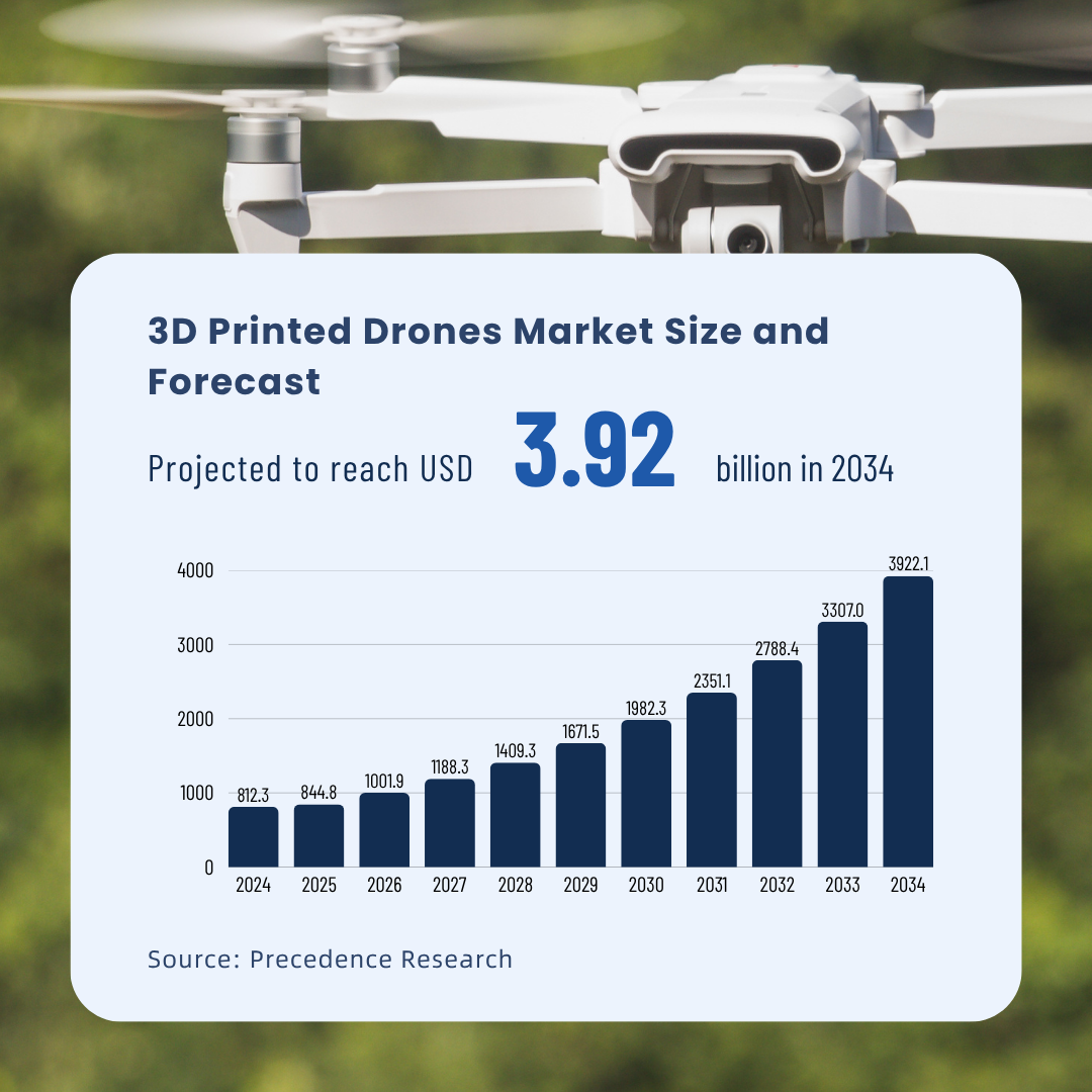 According to Precedence Research, the global market for 3D-printed drones is expected to grow from USD 812 million in 2024 to USD 3.92 billion by 2034, at a compound annual growth rate of 17.1%.